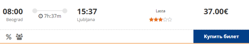 Ниже приведена информация о том, сколько часов вам потребуется, чтобы добраться от Белграда до Любляны, а также приведена примерная стоимость проезда (средняя цена билета) на том или ином виде транспорта.
