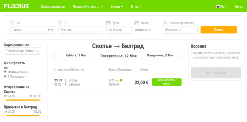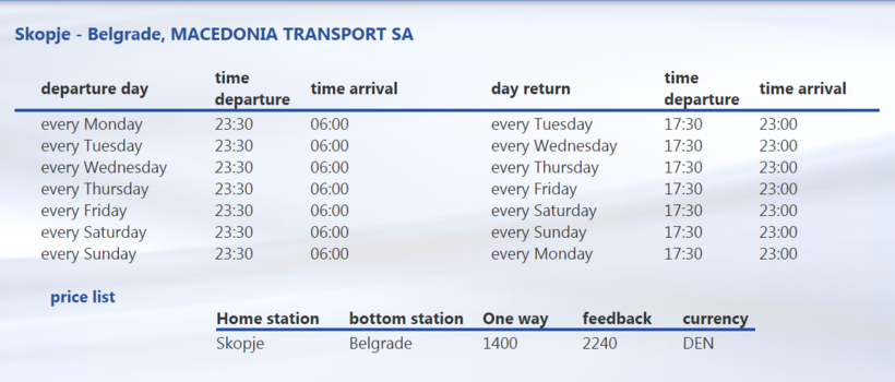 Первый прямой рейс, который я нашла, выполняет компания Flixbus. Автобус отправляется ежедневно в 23:59 с автовокзала Скопье, который расположен по адресу Nikola Karev, 20 (прямо рядышком с ж/д вокзалом). До Белграда ехать нужно 6 ч. 20 мин. В итоге вы прибудете на автостанцию на Zeleznicka 4.