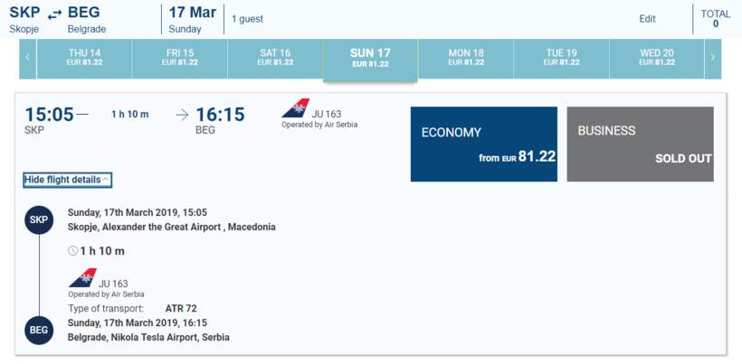 Как ни удивительно, но на такое небольшое расстояние летают самолеты, причем регулярно. Каждый день компания Air Serbia совершает один прямой рейс из аэропорта Скопье «Александр Великий». Вылет в понедельник и четверг в 04:20, в остальные дни недели — в 15:05. Лететь всего-то 1 ч. 10 мин. Но учитывайте еще время на прохождение регистрации и получение багажа. Прибывают воздушные суда в Белградский аэропорт Никола Тесла.
