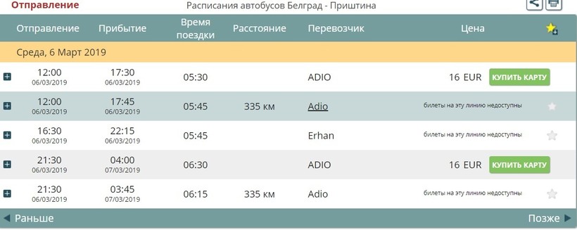Ниже приведена информация о том, сколько часов вам потребуется, чтобы добраться от Белграда до Приштины, а также приведена примерная стоимость проезда (средняя цена билета) на том или ином виде транспорта.