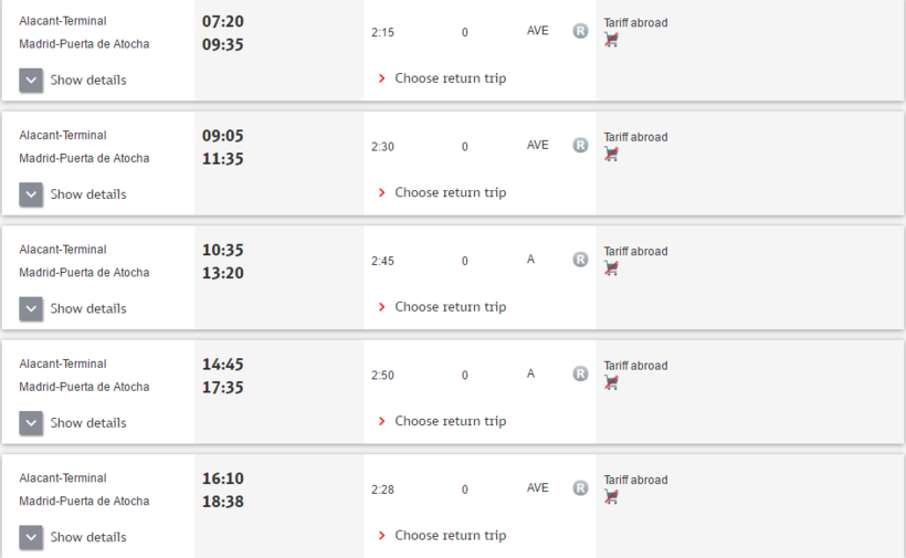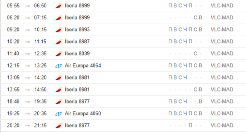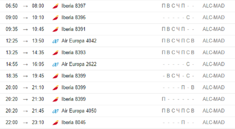 Аэропорта в Бенидром нет, только в близлежащих городах Аликанте и Валенсии. В Аликанте добирайтесь на автобусе компании Alsa, ходят они часто, точное расписание смотрите на их сайте. До аэропорта доедете за 40 минут. Рейсов в Мадрид хватает, почти через каждый час, время в полёте тоже час. Можно посмотреть расписание на сайте или же на скрине ниже.