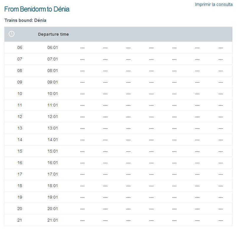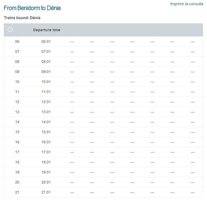В сутки есть 26 рейсов компании Алса, которые соединяют Бенидорм и Дению. Все автобусы прямые, начинают движение в 01:00, а заканчивают в 21:25. В Бенидорме автобусы отправляются от двух остановок по таким адресам: AVENIDA EUROPA 8 и CALLE FRANCISCO LLORCA ANTON, 6. В пути до Дении вы проведете от 40 мин до 2,5 ч, это зависит от выбранного рейса. Пассажиров привозят на конечную - PLAZA ARCHIDUQUE CARLOS, 4, перед этим делая еще одну остановку на AVENIDA MARINA ALTA, 2. Интервал в движении от 5 мин до 2,5 ч, а в ночное время он увеличивается.