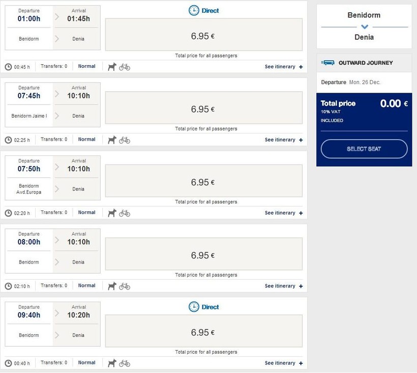 Ниже приведена информация о том, сколько часов вам потребуется, чтобы добраться от Бенидорма до Дении, а также приведена примерная стоимость проезда (средняя цена билета) на том или ином виде транспорта.