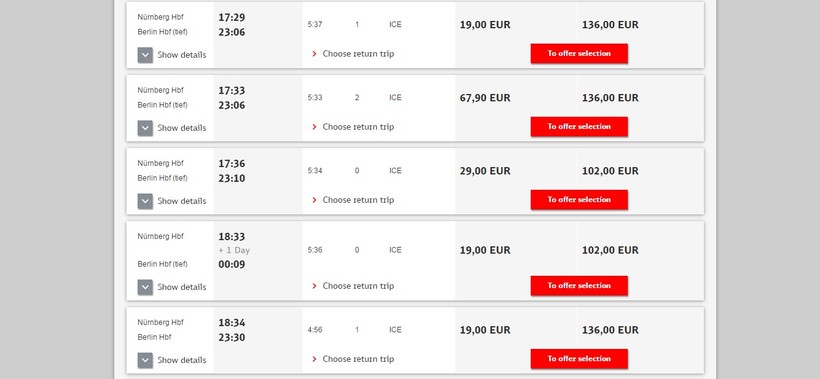 Мне удалось купить заранее два билета до Берлина на скоростной поезд «ICE» за 38 евро по акции. Согласитесь, это очень дешево для такой поездки. Если брать за день или два до поездки, то стоимость может составлять от 60 евро. А если заблаговременно, то намного дешевле будет, вот вижу на сайте и предложения по 19 евро есть.