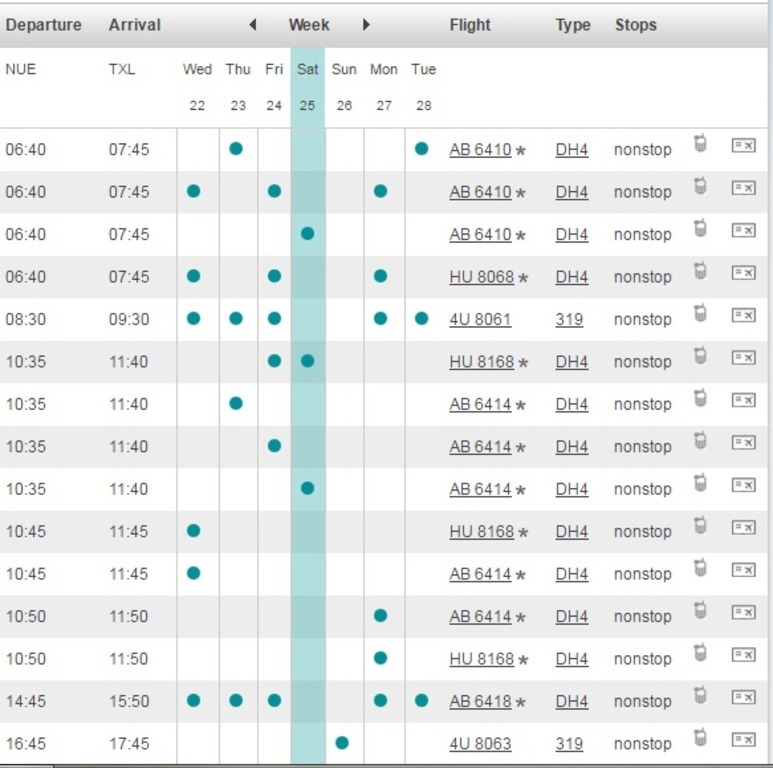 Это фрагмент расписание авиарейсов Нюрнберг-Берлин в зависимости от дня недели.