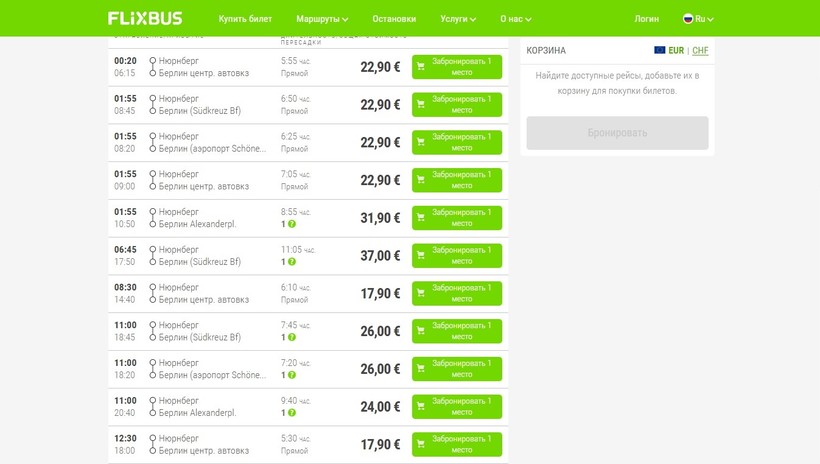 Внимательно изучайте расписание на сайте Flixbus. Некоторые рейсы предусматривают пересадку в Гамбурге или даже в Праге. Кроме этого, уточняйте вокзал прибытия рейса в Берлине.