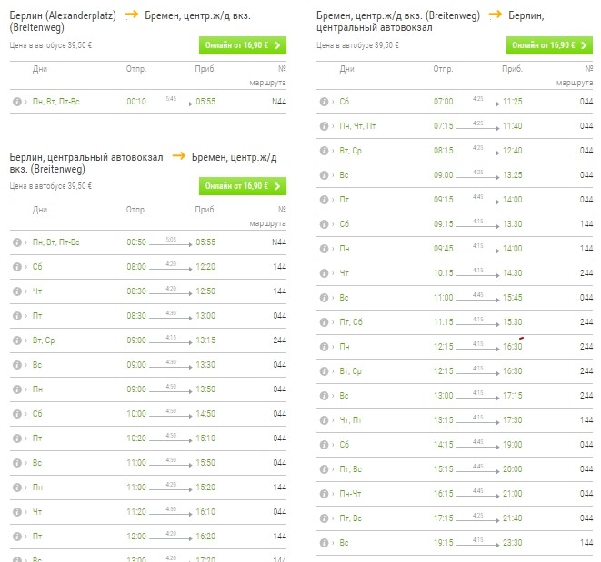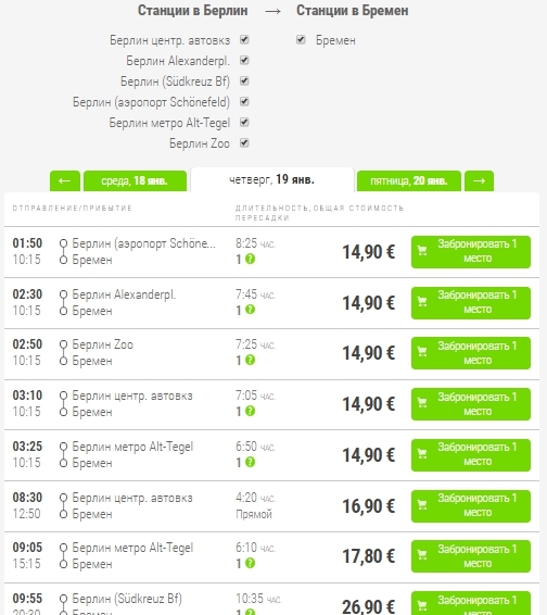 Проведя некоторое время в интернете, выделила для себя основную автобусную компанию, осуществляющую рейсы из Берлина в Бремен. На самом деле таких компаний гораздо больше, но все остальные предлагают билеты на проходящие рейсы, что мне показалось неудобным. Автобусы же немецкой компании Flixbus ежедневно выполняют 4-6 прямых рейсов, кроме того, есть рейсы с пересадкой в Гамбурге и Лейпциге. Время в пути без пересадок от 4 ч. 20 мин. днем до 5 ч. 45. мин ночью. Ночные рейсы, несмотря на большую стоимость, могут стать альтернативой отелю для молодых и энергичных путешественников. Примерное расписание по дням недели можно посмотреть на сайте: