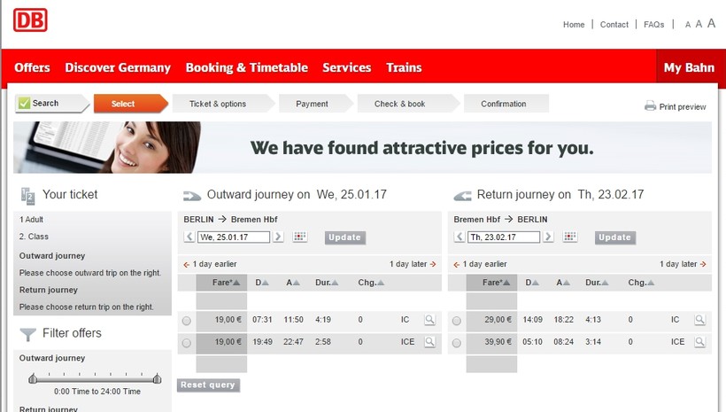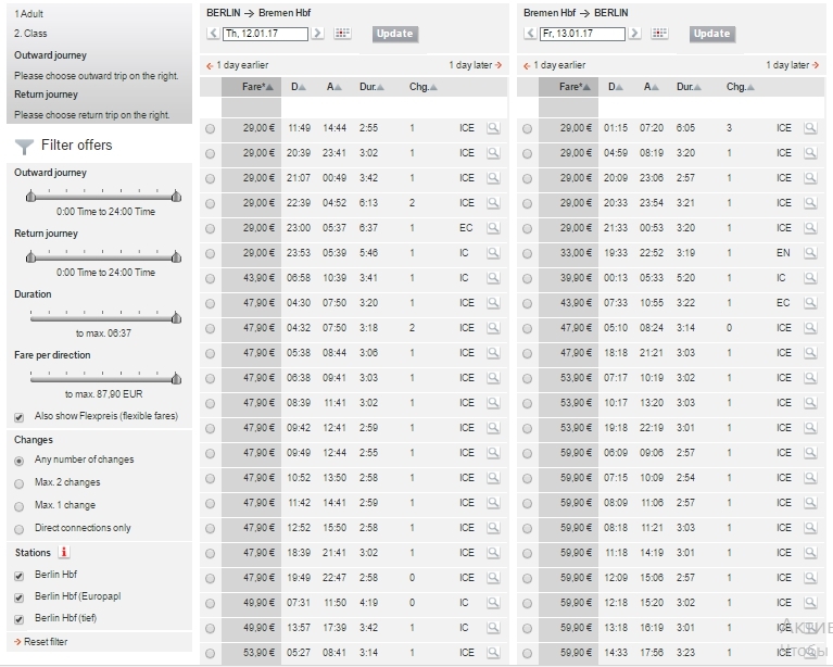 Изначально я скептически отнеслась к идее поездки на поезде, будучи наслышана о дороговизне железных дорог в Германии. Ехать с пересадкой мне не очень хотелось, а первая полученная мной цена на беспересадочные рейсы начиналась от 47 евро во втором классе. Немного поиграв с сайтом, обнаружила кнопку "Saver fare finder". Поставила свои даты и получила результат: 19,9 евро за невозвратный билет.Так что даже на поездках в скоростных поездах можно сэкономить.