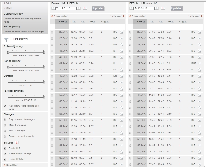 Из Берлина в Бремен мы приехали на поезде, потому что мне удалось купить билеты по низкой цене, поездка на скоростном поезде без пересадок обошлась нам всего в 19,9 евро. Однако, пока мы определялись с датой обратной поездки, цены поднялись и, зайдя на сайт немецких железных дорог, я увидела похожую картинку: