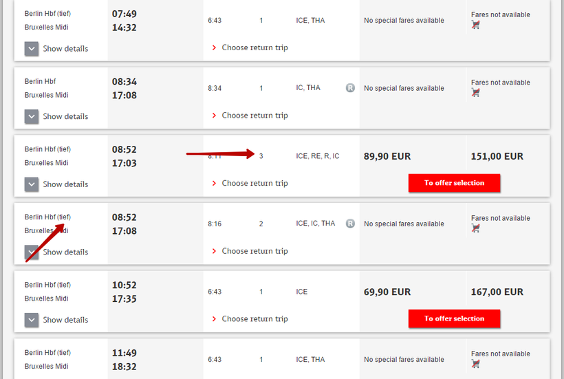 Можно доехать до Брюсселя на скоростном поезде InterCityExpress (ICE), они ходят с центрального вокзала Берлина довольно часто, можно посмотреть подробное расписание на официальном сайте немецких железных дорог. Поезда в Брюссель идут не напрямую, а с пересадкой в Кёльне, целиком дорога занимает 6 с половиной часов. Конечную станцию можно выбирать любую по своему желанию. Подробнее узнать про железнодорожный транспорт Германии можно вот здесь.