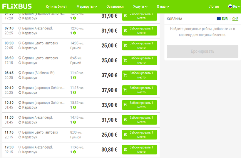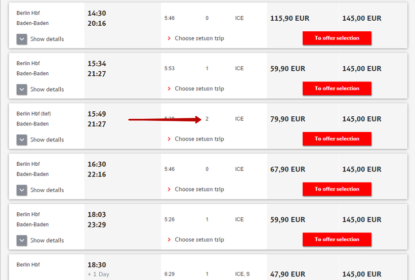 Вот расписание поездов Берлин – Баден-Баден с сайта. Обращайте внимание на количество пересадок.