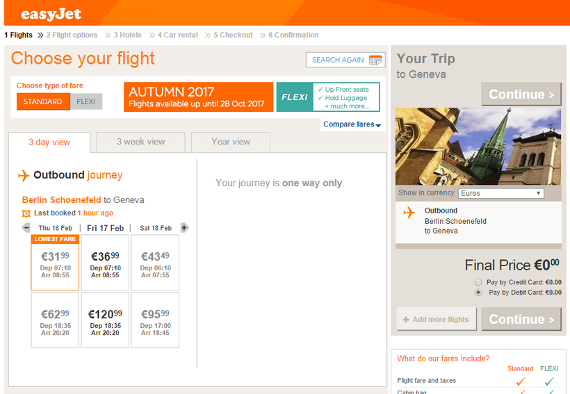 Пожалуй начать стоит с варианта, которым воспользовался я. В конце концов, все раздумья по поводу дороги сводятся к двум вопросам – добираться быстро или добираться дёшево. Я решил, что скорость для меня важнее денег, полетел самолётом и не прогадал – это не только самый быстрый, но и самый дешёвый способ. Возле Берлина есть несколько аэропортов, но прямые рейсы в Женеву вылетают только из аэропорта «Берлин Шёнефельд», перевозками занимается компания «EasyJet». Добраться туда из города легко, к аэропорту ходят поезда и электрички S-Bahn, а также специальные экспресс-поезда RE7 и RB14. Сесть на поезд можно на любом вокзале Берлина – на Центральном, Восточном или Фридрихштрассе, выбирайте какой вам удобнее. Поезда ходят часто (что и не удивительно – когда поезда в аэропорт ходили редко?), дорога заняла у меня минут 25, наверное. Самолёты в Женеву вылетают каждый день, так что переживать не стоит, главное заранее купить билет. Я покупал где-то за неделю, билетов было ещё довольно много.