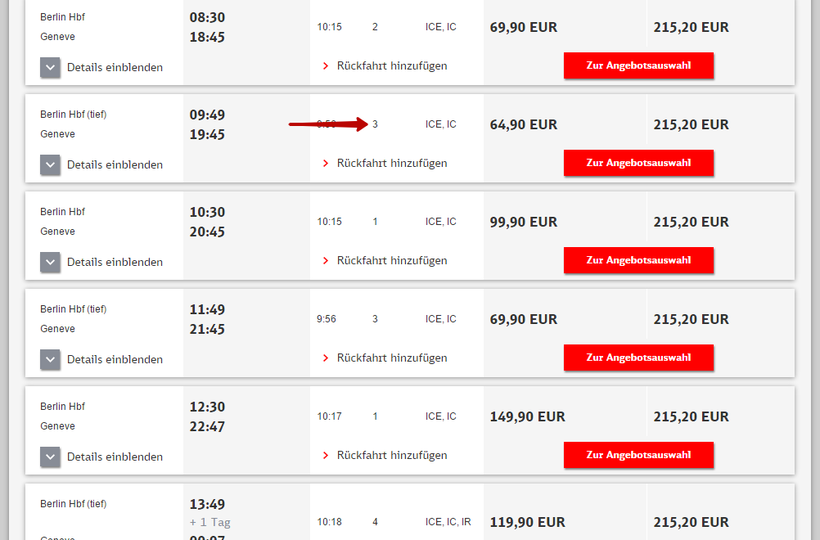 Теперь перейдём к альтернативным вариантам, которые мне удалось разузнать. Если не лететь на самолёте, то что первым приходит на ум? Правильно – поезд! А где можно сесть на поезд? Конечно на центральном вокзале Берлина. Правда, поезда, который идёт прямиком в Женеву, мне найти не удалось, видимо их вообще не существует в природе. Доехать можно только с пересадками – одной, двумя, или даже тремя. Есть очень много вариантов, как ехать и где делать пересадку, в любом случае дорога на поезде отнимает примерно 10 часов времени. Описывать отдельно каждый маршрут – только терять время. Проще всего воспользоваться официальным сайтом немецких железных дорог, там можно исходя из начальной и конечной точки построить сложный маршрут, на котором подробно посмотреть как ехать, где пересаживаться и сколько это займёт времени. В Германии удобно то, что не нужно покупать отдельный билет на каждый отрезок маршрута, достаточно будет и одного единого билета на весь путь. О том, как купить билеты, да и вообще, как не потеряться в сложной системе классификации немецких поездов, можно узнать вот тут.