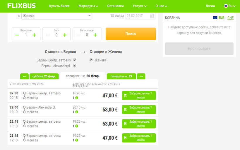Если ехать на автобусе то тоже не обойдётся без пересадок. Автобусы до Женевы ходят с Центрального берлинского автовокзала, перевозкой занимается фирма «Flixbus». В день можно найти три – четыре рейса до Женевы с одной пересадкой, в основном это маршруты через Мюнхен и Франкфурт. Дорога на автобусе – это от 17 до 22 часов дороги, такое испытание может выдержать далеко не каждый, даже несмотря на то, что автобусы у «Flixbus» на весьма неплохом уровне. Если готовы испытать на себе все тяготы автобусного переезда, то в первую очередь стоит посетить сайт компании «Flixbus», там можно посмотреть подробное расписание рейсов, детали маршрута, а также точный адрес вокзалов и остановок. Сайт поддерживает русский язык, так что разобраться в нём несложно.