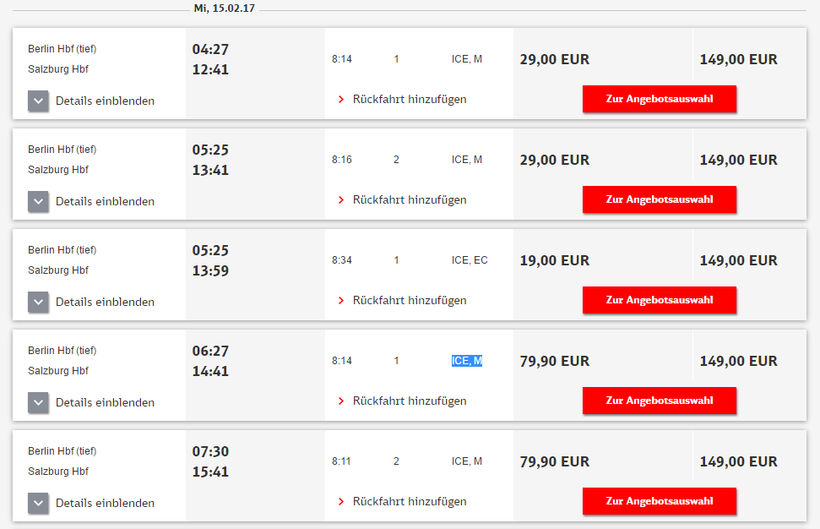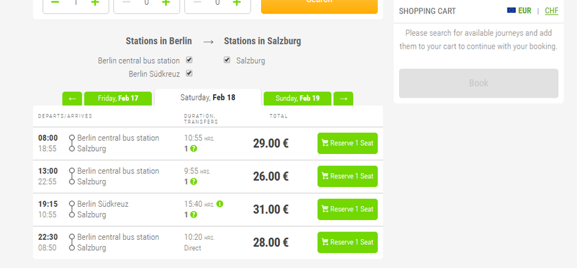 Железнодорожный транспорт стартует с центрального вокзала Берлина (Europaplatz 1), прибытие на главную станцию Зальцбурга (Südtiroler Platz 1). Но, можно подобрать и отправление с другого вокзала.