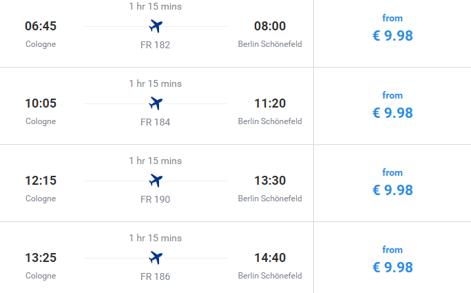 Ниже приведена информация о том, сколько часов вам потребуется, чтобы добраться от Кёльна до Берлина, а также приведена примерная стоимость проезда (средняя цена билета) на том или ином виде транспорта.