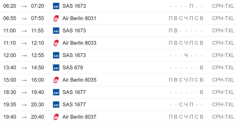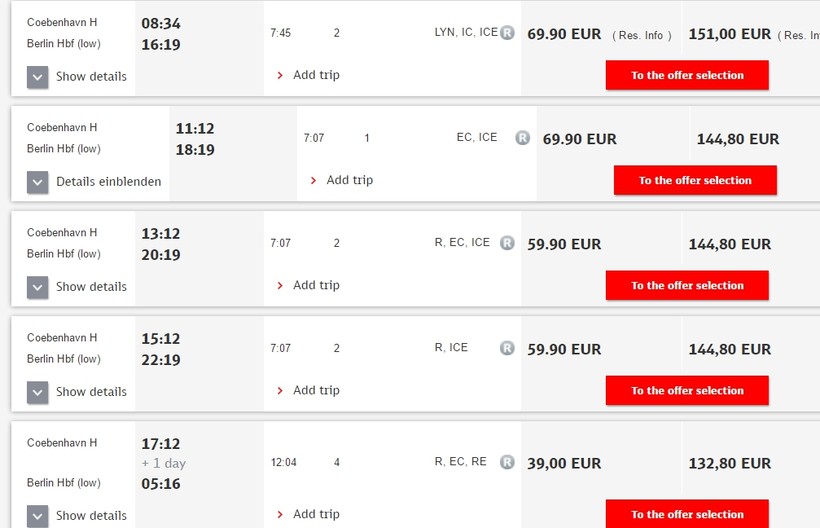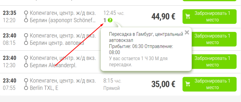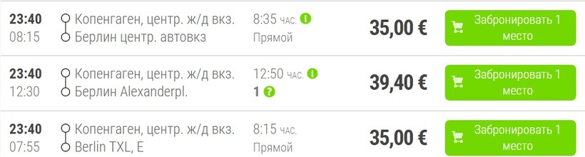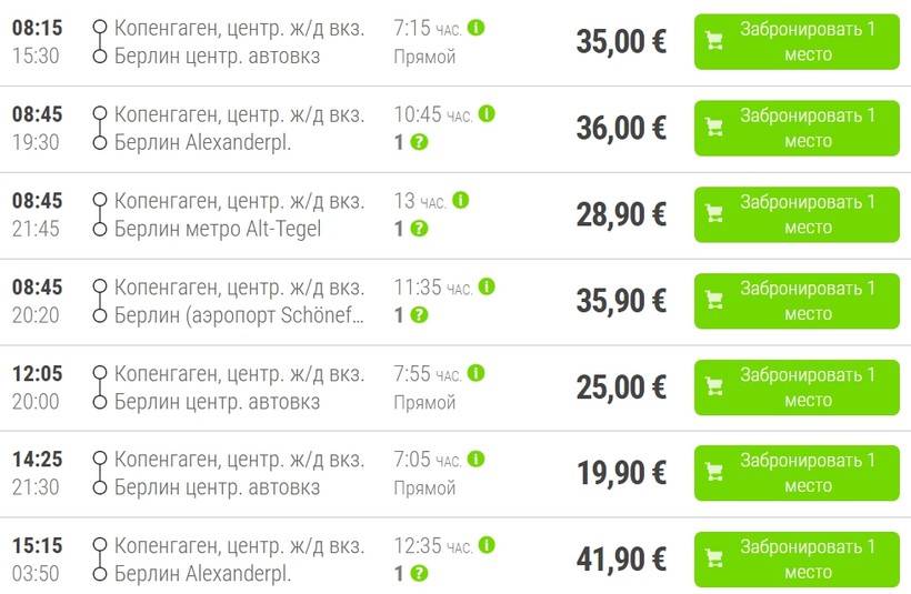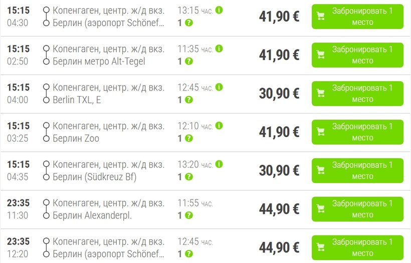 Ниже приведена информация о том, сколько часов вам потребуется, чтобы добраться от Копенгагена до Берлина, а также приведена примерная стоимость проезда (средняя цена билета) на том или ином виде транспорта.