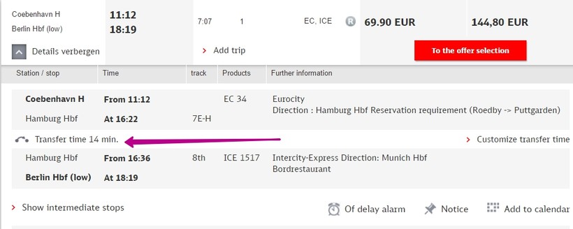 Оптимальный маршрут с одной пересадкой в Гамбурге. Ждать не долго, всего 14 минут.