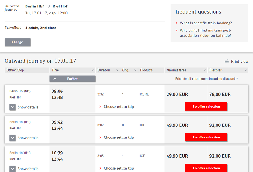 Если время не ждёт, то можно преспокойно доехать до Киля с пересадкой в Гамбурге. Такая дорога на самом деле занимает всего на час больше времени, чем прямой поезд, а порой между ними и вовсе нет никакой разницы. С берлинского вокзала «Hauptbahnhof» можно доехать в любую точку страны, в том числе и до Гамбурга (там тоже «Hauptbahnhof» или «центральный вокзал» по нашему), а из Гамбурга можно спокойно доехать до Киля. Точное расписание поездов, можно посмотреть на официальном сайте, о котором я уже упоминал выше. По этому маршруту ходят точно такие же скоростные поезда ICE и общая стоимость поездки такая же как и на прямом поезде – можно найти билеты и за 29 евро и за 129 евро.