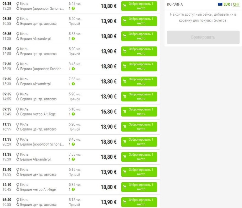 Автобусы компании Flixbus совершают прямые рейсы до Берлина примерно каждые 2 часа, начиная с раннего утра и заканчивая 17 часами вечера. В зависимости от сезона расписание может меняться, имейте в виду. Отправляются автобусы от Главного вокзала Киля, находящегося на Kaistraße 100. Через 5 ч. 20 мин. пути они привозят пассажиров на Центральный автовокзал Берлина (на Masurenallee 4-6). Это я написала о прямых рейсах. Если же вам нужно попасть из Киля прямо в аэропорт Берлина Schönefeld, то выбирайте автобусы с пересадкой в Гамбурге, правда, так дольше ехать. У перевозчика хорошие, современные салоны, с кондиционерами, беспроводным интернетом и розетками. Я видела информацию о том, что Flixbus может опаздывать.