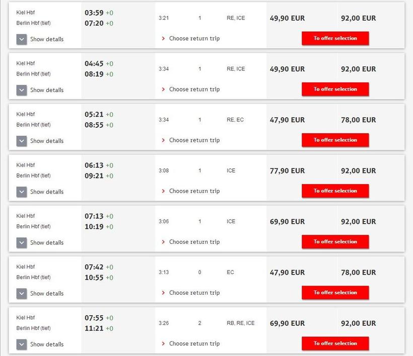 Рейсы с пересадками отправляются с 03:59 до позднего вечера каждые 30-60 мин. Время в пути до Берлина – 3-4 ч. Садиться нужно на Главном вокзале Киля на Sophienblatt 25-27, а выходить в Берлине тоже на Главном вокзале на Europaplatz 1. За 8-9 мин до конечной остановки поезд останавливается на вокзале Berlin-Spandau, где тоже можно будет выйти, если вам так удобней.
