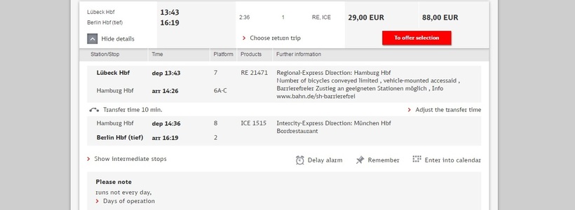 Из Любека в Берлин прямых рейсов нет. Все маршруты предусматривают пересадку в Гамбурге. Ниже фрагмент расписания по этому направлению с сайта Deutsche Bahn.