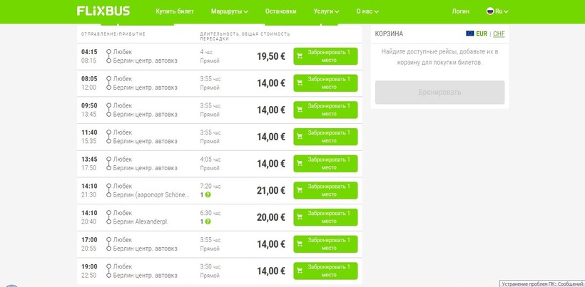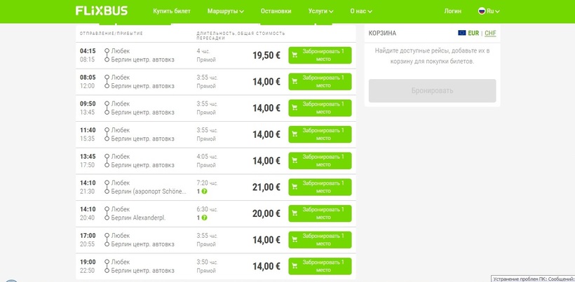 Из Любека в Берлин можно доехать на автобусных рейсах компании Flixbus. Вот фрагмент расписания с сайта этой компании.