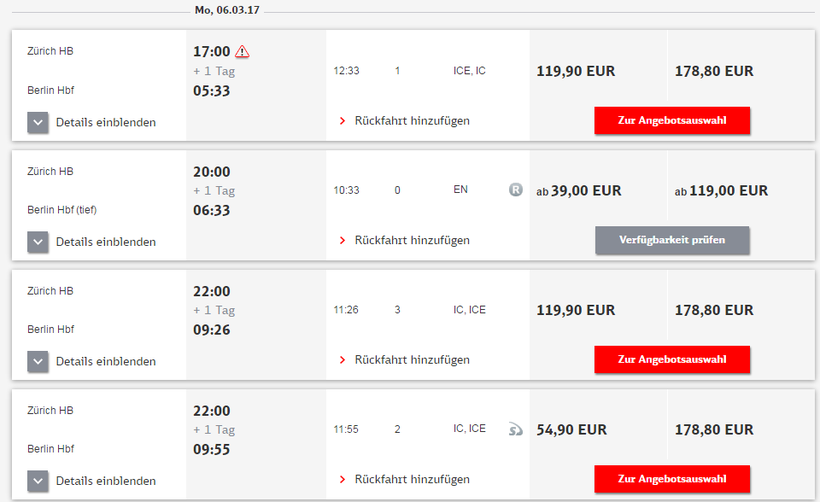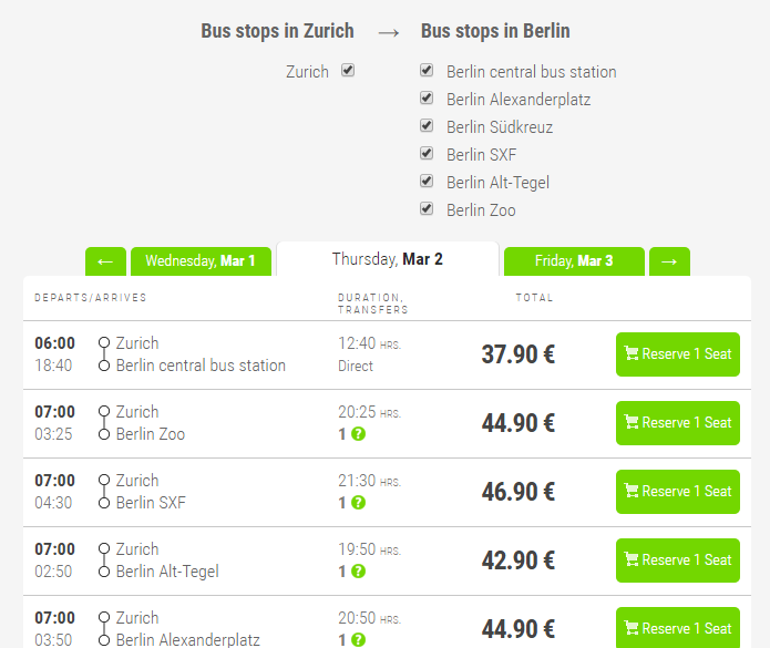 Ниже приведена информация о том, сколько часов вам потребуется, чтобы добраться от Цюриха до Берлина, а также приведена примерная стоимость проезда (средняя цена билета) на том или ином виде транспорта.