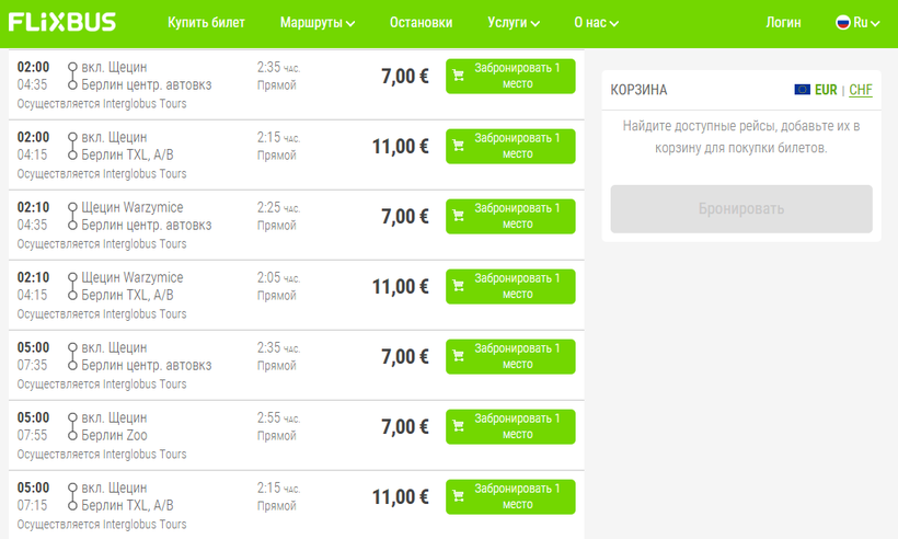 Перевозками из Щецина в Берлин занимается компания FlixBus. Автобусы ходят круглосуточно с перерывами в два-три часа: первый рейс отправляется в 2:00, последний в 19:00. Мы садились на автобус на Центральном автовокзале Щецина, но есть ещё одна остановка – автовокзал Warzymice.
