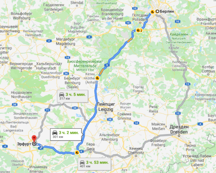 Берлин и Эрфурт разделяет 300 км, и проехать это расстояние по отличным немецким автобанам можно всего за 3 часа. Путь из Берлина лежит по автобану А9 до Хермсдорфа, а дальше до самого Эрфурта — по автобану А4. Все автобаны на маршруте шести- и восьмиполосные, и к тому же можно ехать по ним с высокой скоростью.