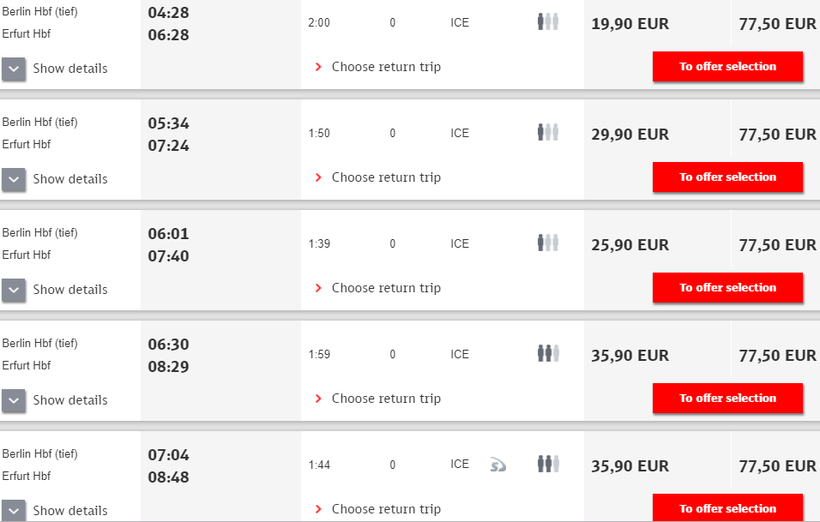 Билеты на поезда в Германии не самые дешевые. Так, поездка из Берлина в Эрфурт обойдется от 20 евро (1450 руб.), и это на самый ранний утренний поезд. А в течение дня билеты в вагон 2-го класса могут стоить от 26 до 70 евро (1470–5050 руб.).