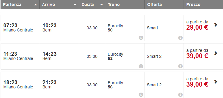 Ежедневно с центрального железнодорожного вокзала Италии отправляется три поезда. Составы отбывают из Милана в сторону Берна в 07:23, 11:23 и в 18:23. В дороге нужно будет провести всего три часа.