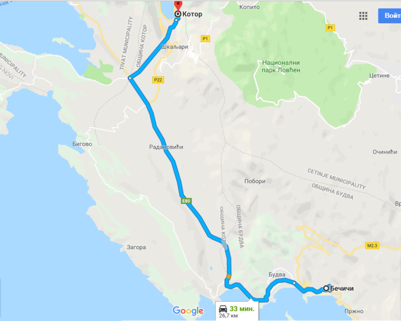 Бечичи и Котор разделяют всего 27 км, которые на машине можно проехать за 35 мин. Путь до Котора лежит по двухполосной дороге Е80, и учитывая горный рельеф страны, будьте готовы к крутым поворотам и серпантинам. Платных дорог в Черногории нет.