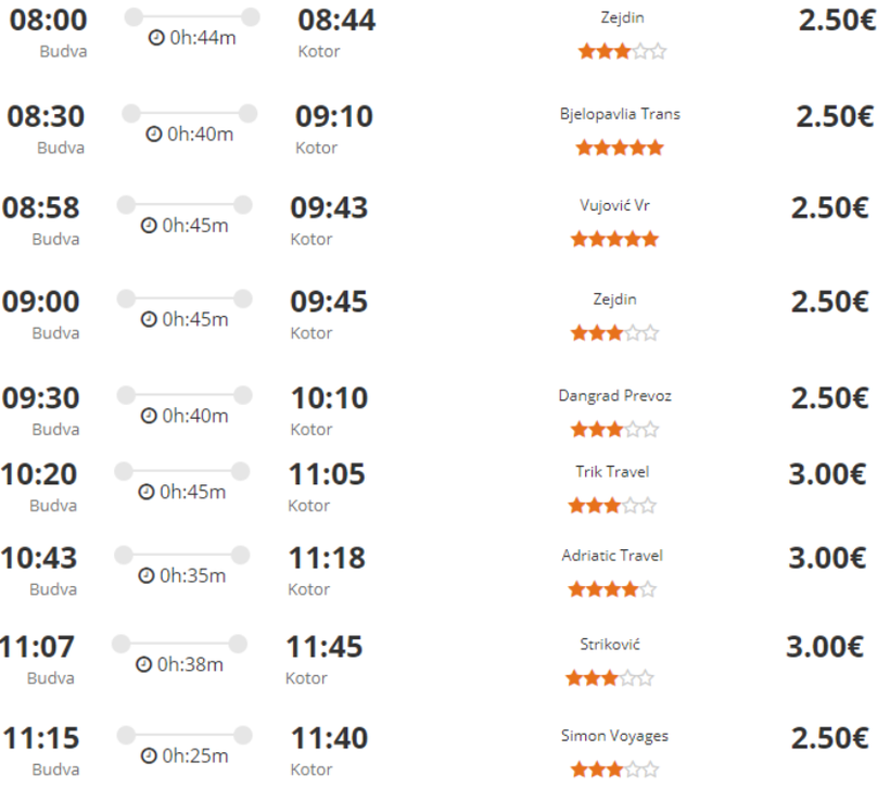 Из Будвы в Котор автобусы курсируют ежедневно с 08:00 до 21:47 с интервалом в 5–25 мин. Путь до Котора автобусы преодолевают в среднем за 40–45 мин. А основными перевозчиками по маршруту являются компании: