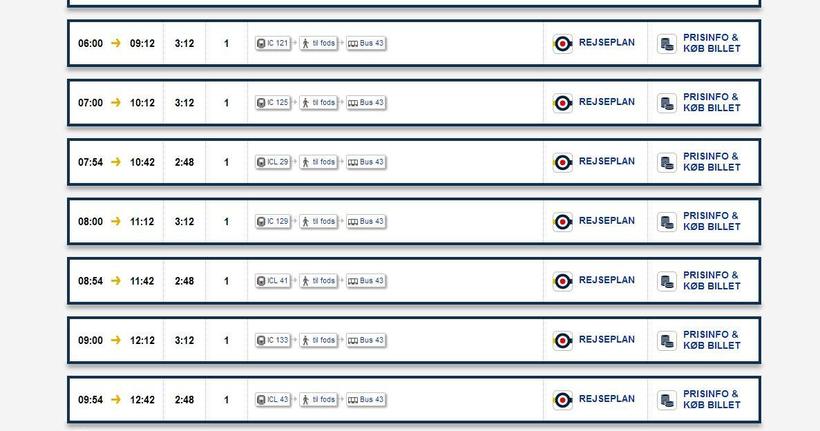 Расписание поездов и автобусов составлено таким образом, что вам не придется тратить лишнее время на ожидание. Наоборот, порой на пересадку выделяется всего минут 5-7, и за это время пассажиру нужно выйти из вокзала и быстро найти нужный автобус (в Биллунд едет автобус №43). В общей сложности дорога в среднем займет около 3 часов.