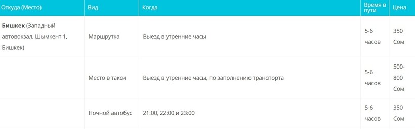 Ниже приведена информация о том, сколько часов вам потребуется, чтобы добраться от Бишкека до Каракола, а также приведена примерная стоимость проезда (средняя цена билета) на том или ином виде транспорта.