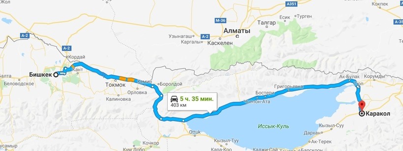 Расстояние между Бишкеком и Караколом составляет 311 километров или 193 мили по прямой и 400 километров или 248 миль по автодорогам.