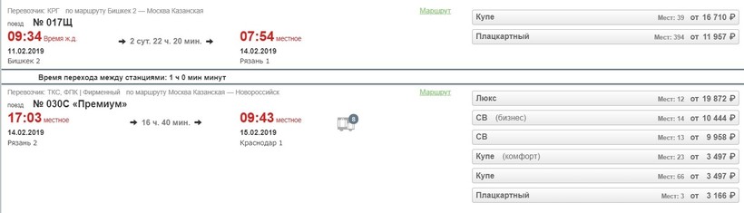 Билет на поезд до Краснодара от 16000 сомов (это примерно 15000 рублей).