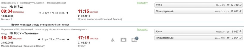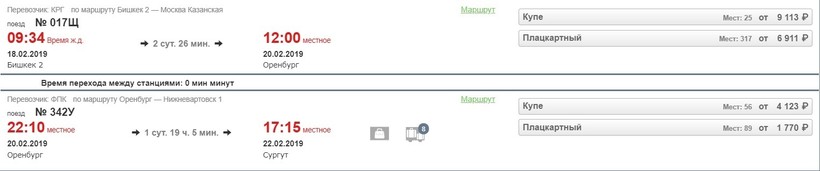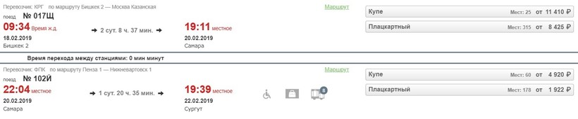 Проездные документы до Сургута от 9130 сомов (от 8700 рублей). Это не намного дешевле, чем на самолете, а ехать придется гораздо дольше.