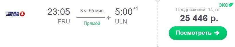 Из аэропорта «Манас» прямые рейсы до монгольской столицы есть только по понедельникам, средам, пятницам. Вылет в 23:05. Полет продлится почти четыре часа.