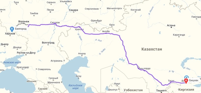 Настоятельно не рекомендую вам ехать по этому маршруту на автомобиле. Расстояние от Бишкека до Белгорода — 3700 километров. Вам придется сделать минимум три остановки на ночлег и это дополнительные траты. Плюс дорога на большей части пути в плохом состоянии, так что пожалейте свою машину.