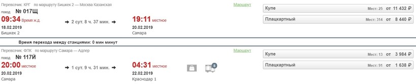 Билет на поезд до Краснодара от 11000 рублей (от 10700 сомов). Проездные документы в Крым от 900 рублей (от 950 сомов).
