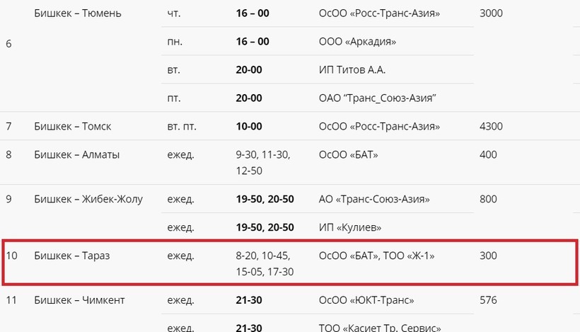 Четыре автобуса в ежедневном режиме курсируют из Бишкека в Тараз. Отправляются они с автовокзала, который находится на улице Чимкенсткой, 1.