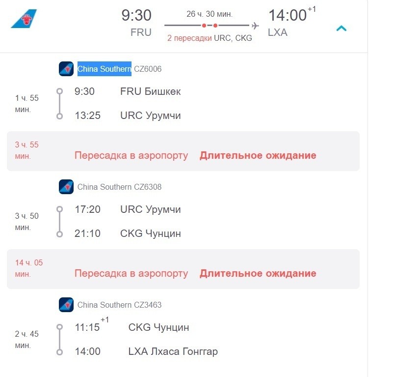 Главный город Тибета — Лхаса, я летела до него. Из аэропорта Бишкека «Манас» прямые рейсы до него не осуществляются. Нужно лететь с пересадками. Их можно сделать, например, в Урумчи и Чунцине. На дорогу уйдет немногим более суток. Все рейсы выполняет China Southern.