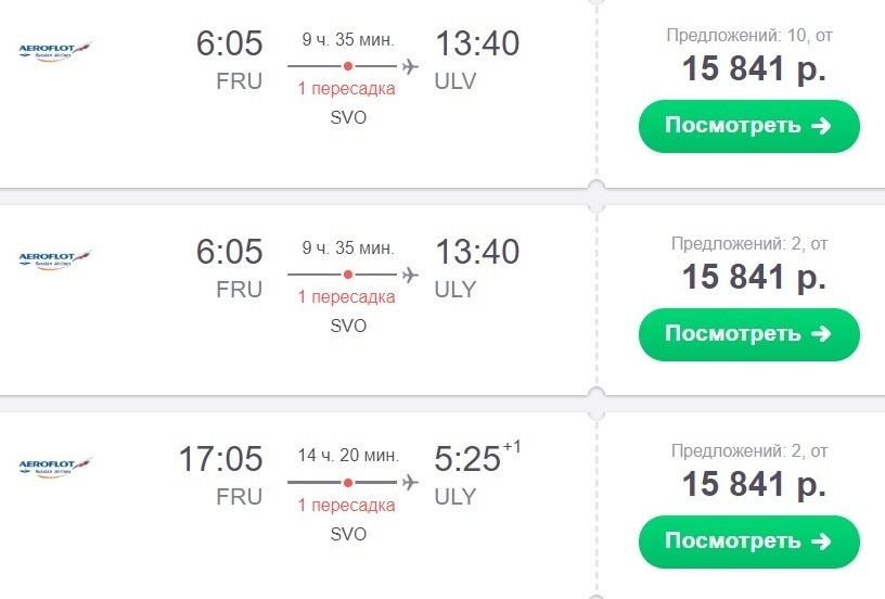 Билеты до Ульяновска от 9650 сомов или 9100 рублей.
