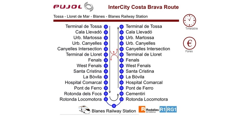 Автобусы ездят с 7 утра и до 9 вечера, даже нет смысла запоминать расписание. Этот рейс в Бланесе останавливается и возле железнодорожного вокзала, на автостанции (Rotonda Locomotora), затем едет а Ллорет-де-Мар (Terminal de Lloret) и конце концов завершает поездку в Тоссу-де-Мар на автостанции (Estació d'Autobusos de Tossa de Mar), которая находится по адресу Carrer Torrent Viver.