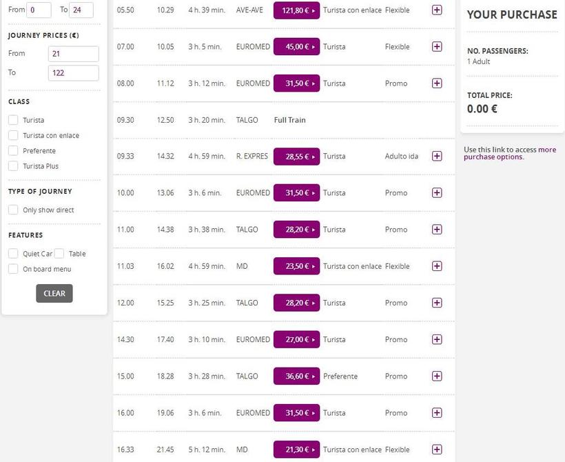 Как и у нас, в Испании тоже билеты продаются в вокзальных кассах. Кроме этого, можно купить их в терминале или онлайн. При покупке заранее возможна ощутимая экономия.