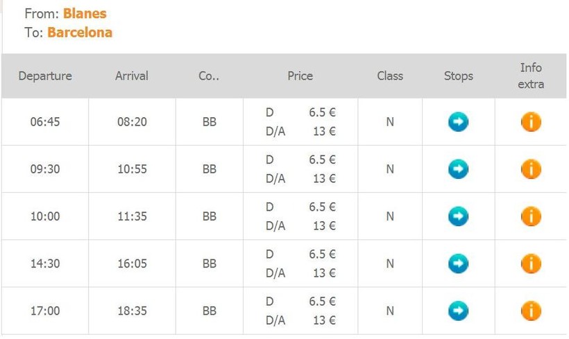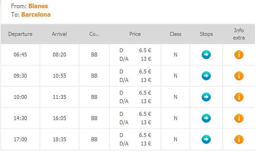 ЖД вокзал в Бланесе находится по адресу: Avinguda de l'Estació, 55. Отсюда отправляются электрички линии R1 до Барселоны каждые 12-30 мин. За менее, чем полтора часа можно доехать до вокзала SANTS (на улице Rector Triadó, 75), начиная с 6 ч и заканчивая почти 22 ч. Не пугайтесь, испанские пригородные поезда не имеют ничего общего с нашими, тут все намного более цивилизованно, чисто и красиво.