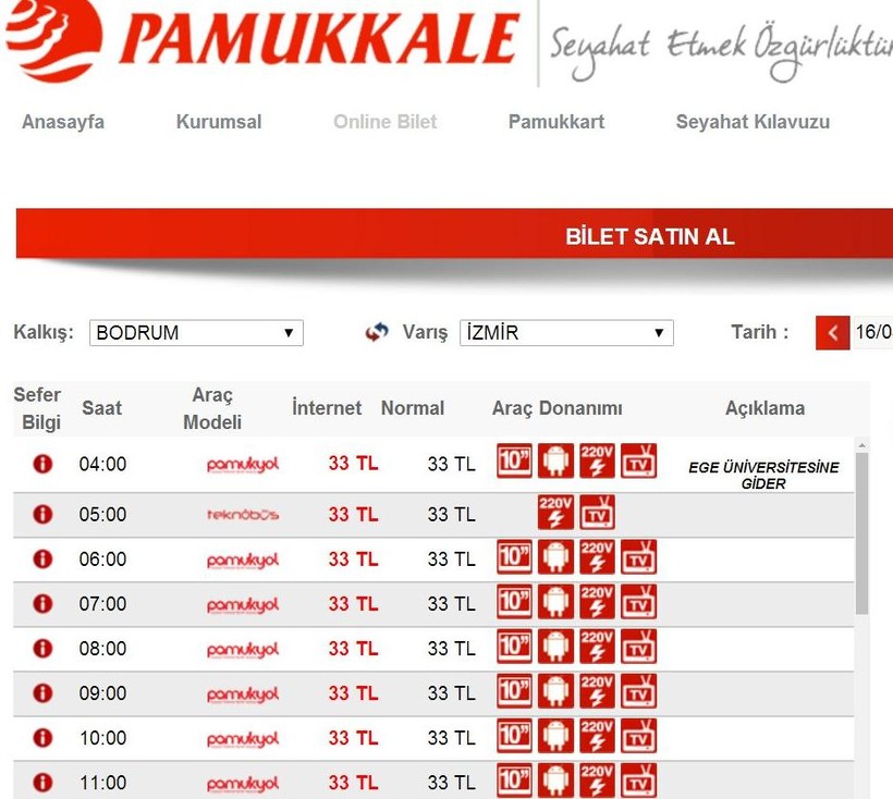 Билеты продаются как в кассах автовокзала (Otogar по-турецки), так и на официальных сайтах перевозчиков Pamukkale, Kamil Koc и Metro Turizm.