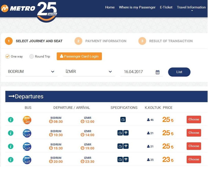 Компания Метро Туризм совершает всего лишь 4 выезда в сутки: в 08:30, 10:30, 15:30 и 20:00. Автобусы довезут вас до Измира также за 3,5 часа. В салонах имеется бесплатный беспроводной интернет и телевизор.